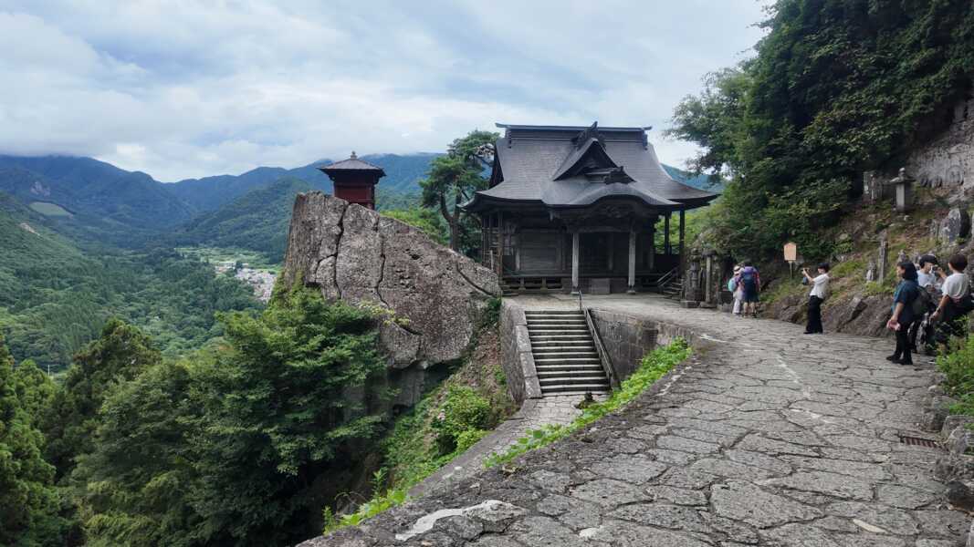 登山口から1070段以上の石段が続き、絶壁の上にお堂が建つ山寺です。松尾芭蕉が「閑さや 岩にしみ入る 蝉の声」という俳句を詠んだ地としても有名です。新緑、深緑、紅葉、雪景色と四季折々の風情ある景観を見ることができるスポットです。宝珠山立石寺(山寺)