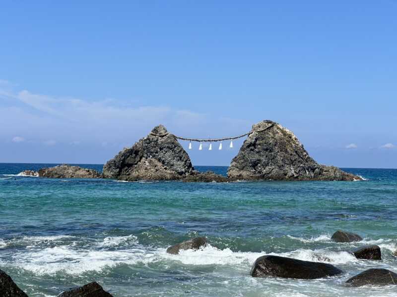 夫婦岩がある所は、夫婦岩の手前に鳥居があり桜井二見ヶ浦で櫻井神社の宇良宮としてお祀りしています。2つの岩は向かって右が男性の神様で伊邪那岐命、向かって左が女性の神様で伊邪那美命が鎮まっている御神体岩として信仰されていて、夕日のタイミングがとても綺麗なスポットです。